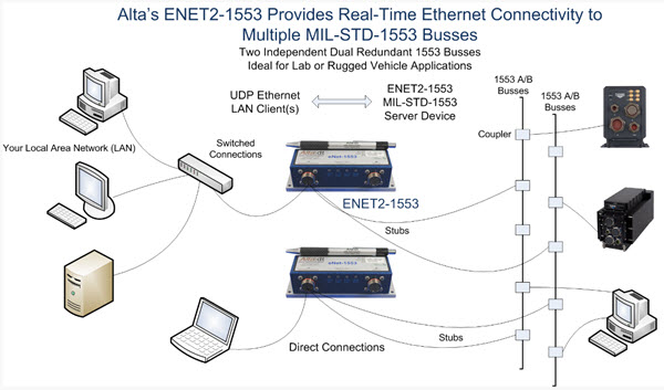 ENET2-1553™ is an innovative product that provides “remoting” of 1553 operations on 10/100/1000 Ethernet IP/UDP local area networks (LAN). eNet2-1553 is a small, low-power, rugged device that provides real-time Ethernet connectivity to for two dual-redundant 1553 (A/B) busses. Ideal for remoting 1553 connections for in-field applications or point-point lab usage.