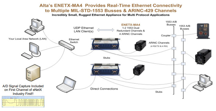 ENET-MA4™ is an innovative product for “remoting” 1553 & ARINC-429/717 operations on 10/100/1000 Ethernet local area networks (LAN). eNetX-MA4 is a very small, low-power, rugged device that provides real-time UDP connectivity to for 1-2 dual redundant 1553 (A/B) busses and 4 ARINC channels. Tested to MIL-STD-704F/810G/461F and DO160.