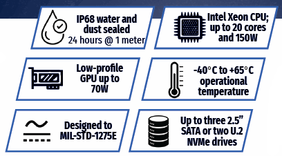The RE3423M is third party certified to IP68 water and dust ingress protection levels with up to 220 watts of combined CPU and GPU power without sacrificing performance at 65°C. This purpose designed chassis enables demanding applications to be deployed into harsh elements and extreme environments. The custom internal heatsinks developed for the RE3423M allow industry leading operation for mission equipment in high temperature environments.